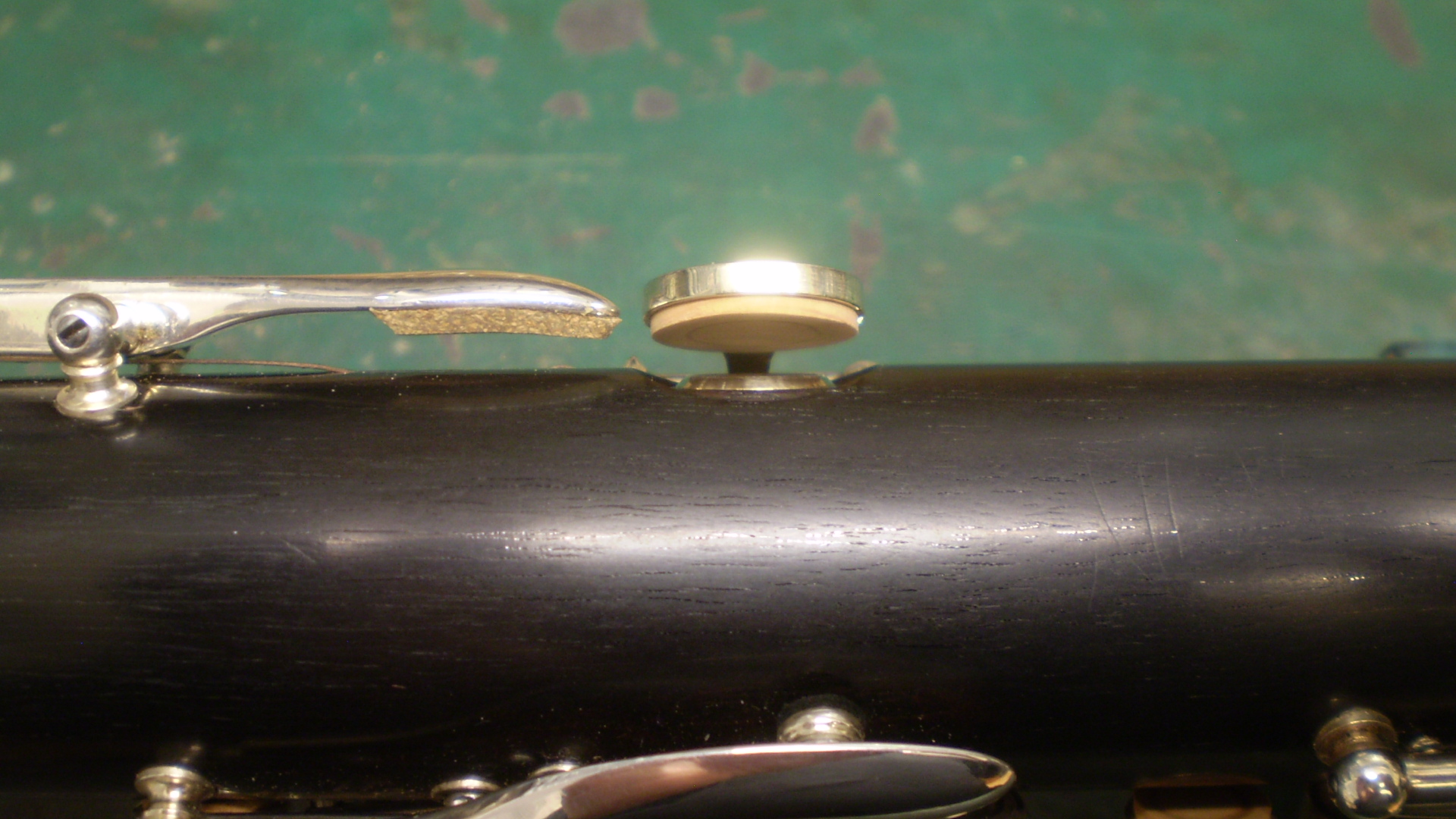 I had enough of that and converted the LH thumb ring on my 1958 Selmer CT full Boehm into a thumbplate, using a large oboe/cor anglais pad cup which was just the right diameter for the job (15.5mm outer diameter/14mm inside diameter). The thumb tube was shortened and turned into a bedplace with a bevelled edge for the thumbplate pad to seat against and that hasn't caused any tuning problems with the lower register F# (LH1 only).