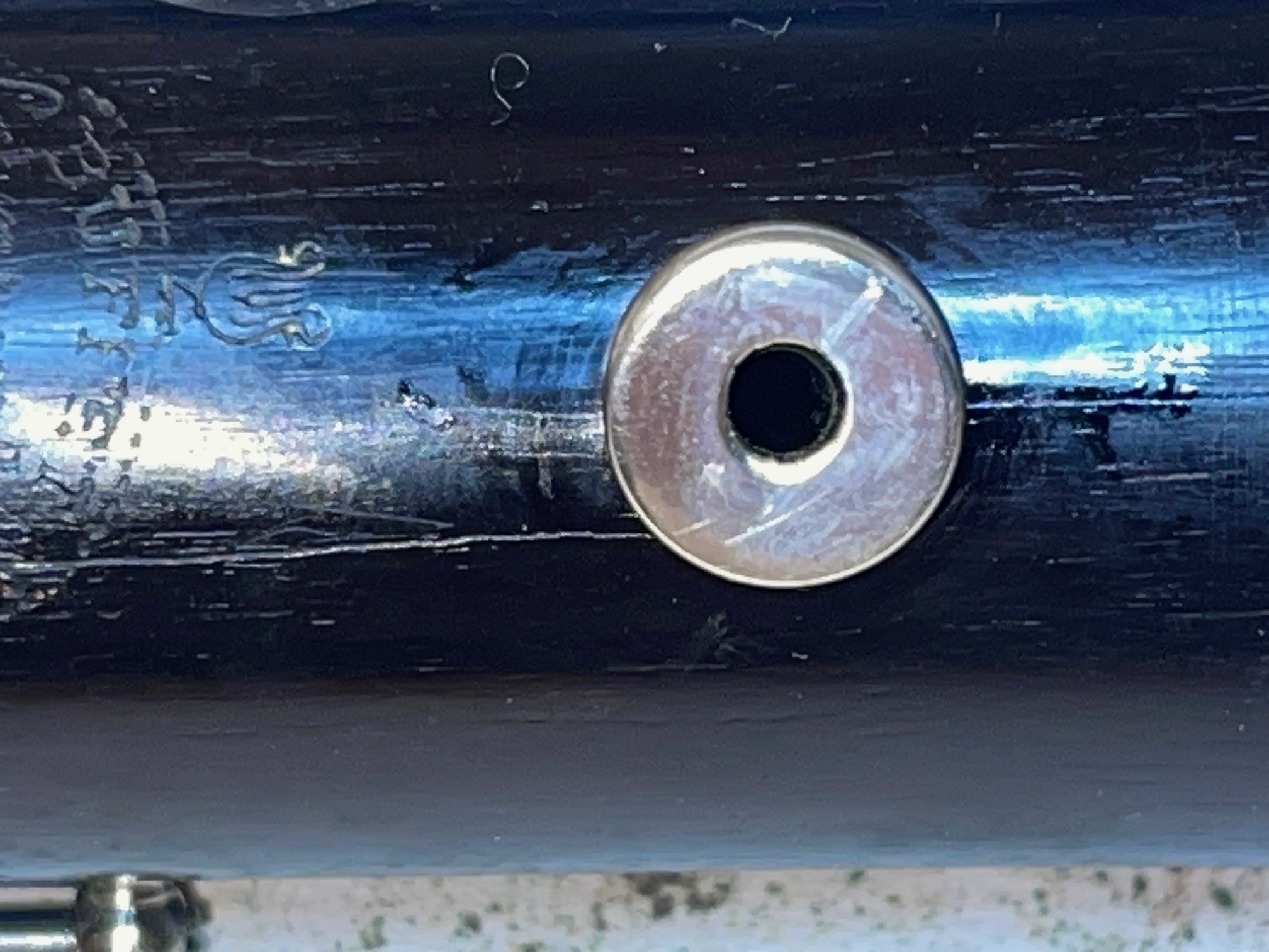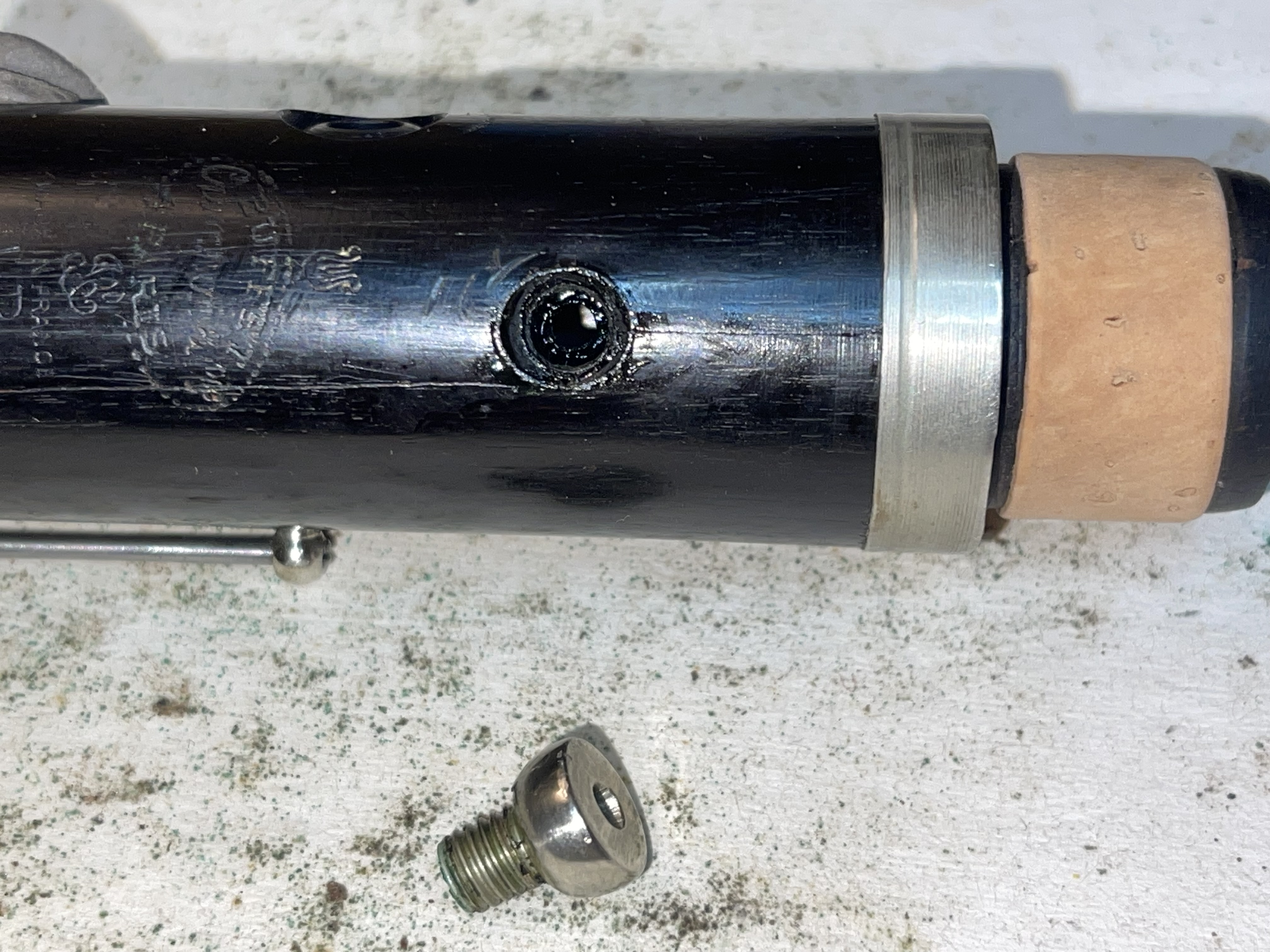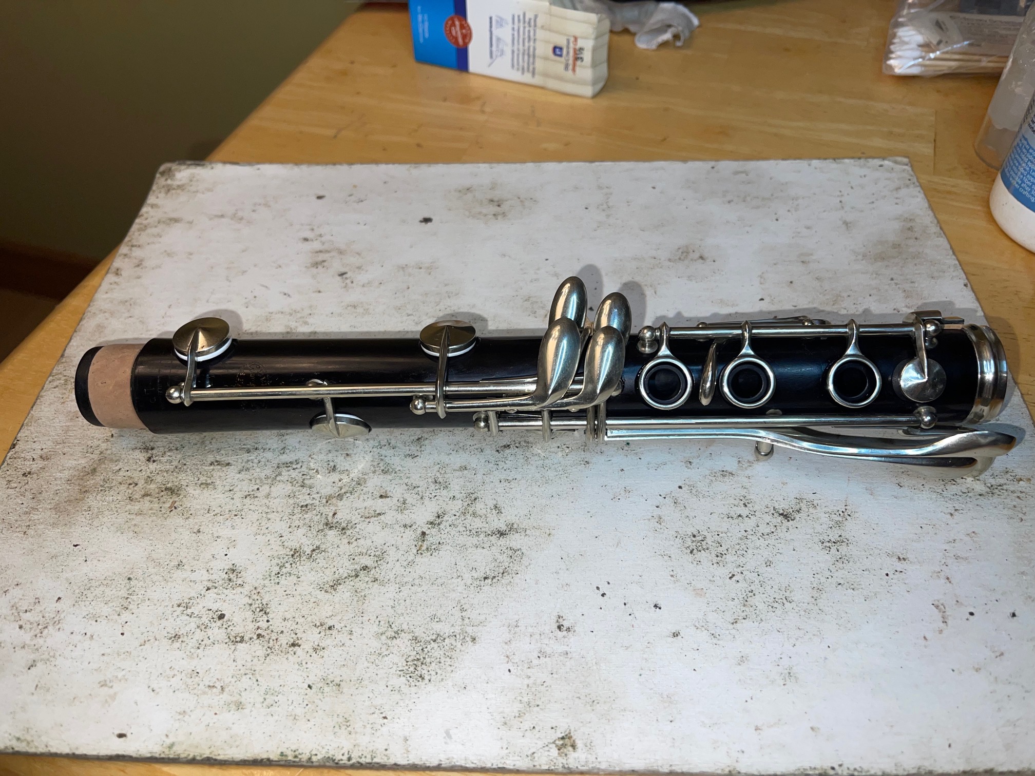 I resealed a bell crack and filled a small chip on the edge of the bell socket, and finished lower joint restoration. Interesting technical solution by Buffet is that the Left F/C lever spring is mounted on the key and goes into a cut-out in the body, but the F#/C# key has a leaf spring that works pretty well (bu
