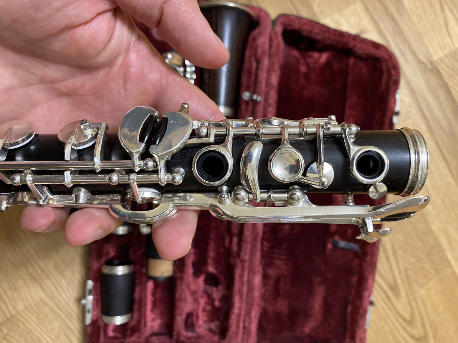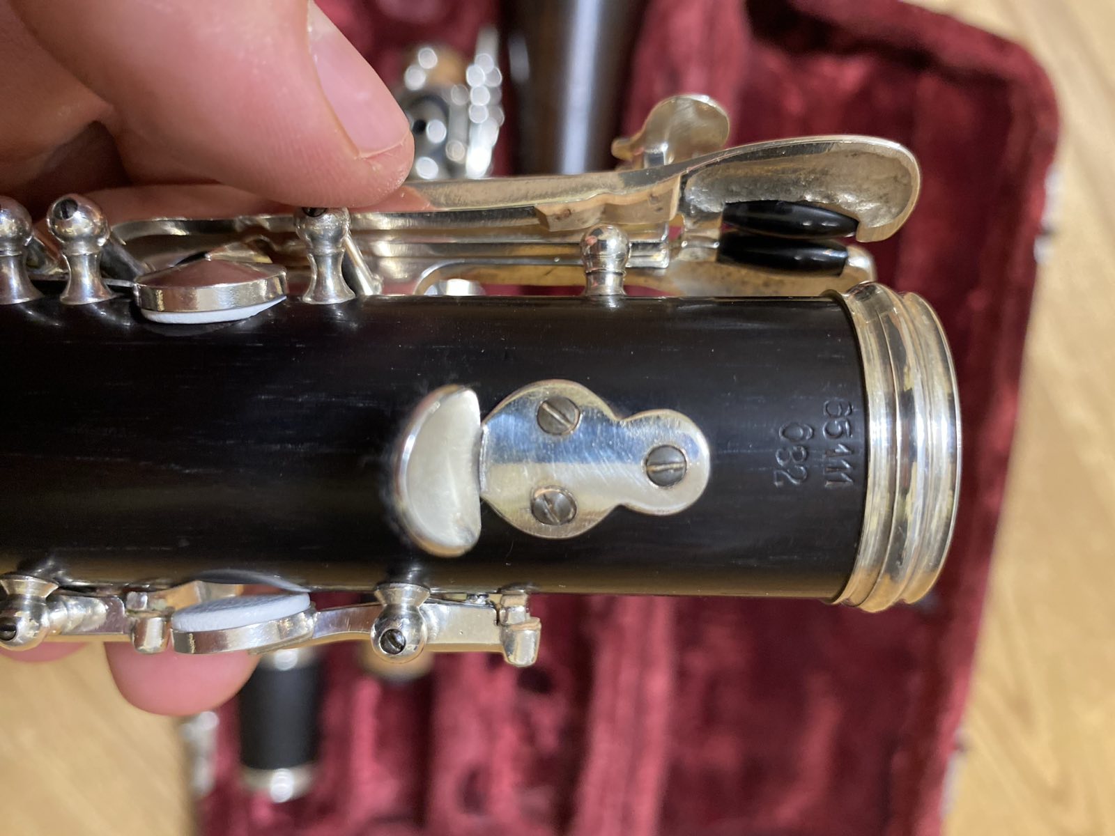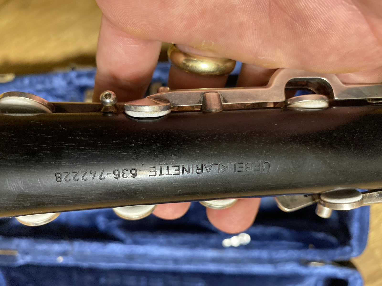 The other clarinet is a model 636, probably from the 80s, made in the GDR. That could use an overhaul; only a few pads have been replaced. One of the original barrels has been shortened, and that one probably has a crack that is not extending to the bore. The body has no cracks, and the plating is in good shape with minor tarnish but no rough surfaces.