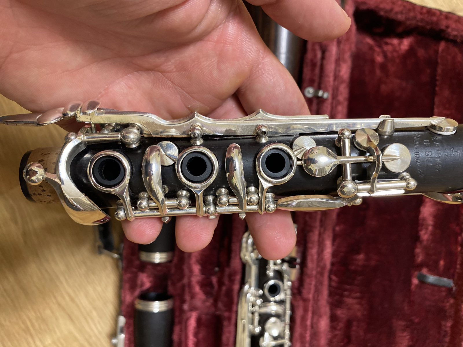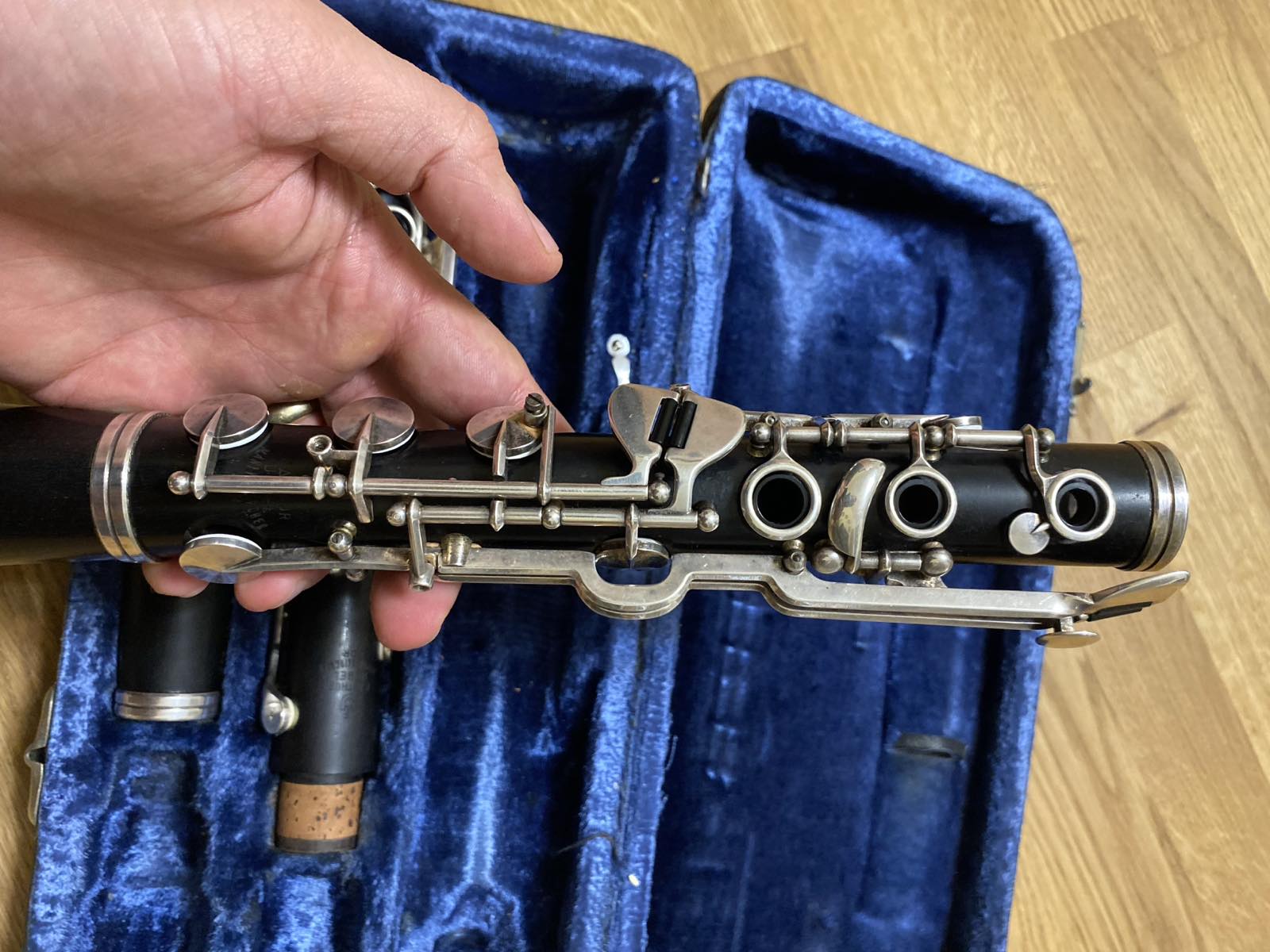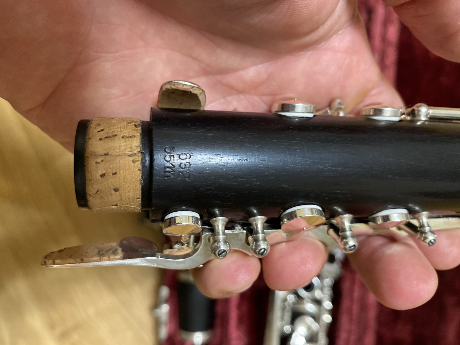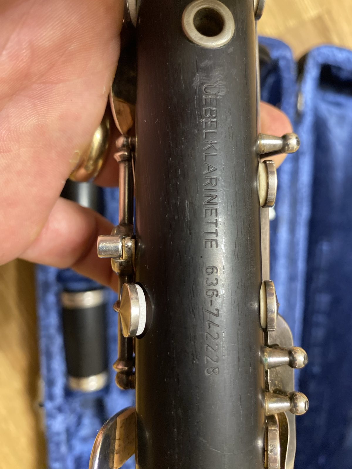 The other clarinet is a model 636, probably from the 80s, made in the GDR. That could use an overhaul; only a few pads have been replaced. One of the original barrels has been shortened, and that one probably has a crack that is not extending to the bore. The body has no cracks, and the plating is in good shape with minor tarnish but no rough surfaces.